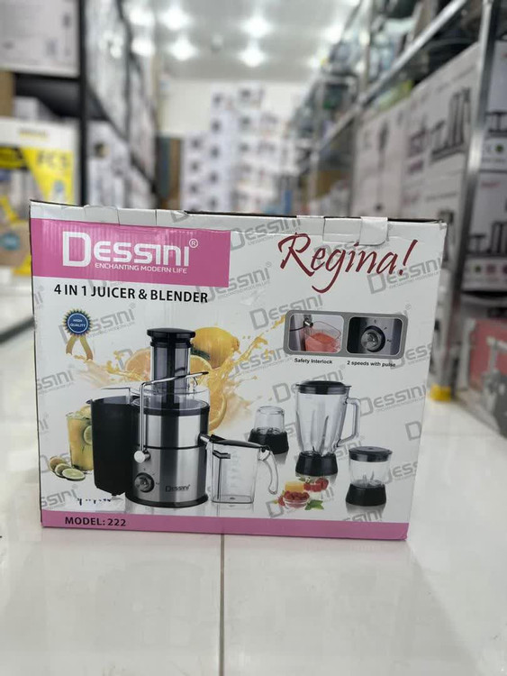 شرکت ایتالیایی دسینی (Dessini) یکی از تولید کنندگان بنام ومشهور ایتالیایی است. این شرکت در تولید انوع لوازم خانگی سابقه درخشانی دارد وبه دلیل کیفیت بسیار بالا ، طراحی های متنوع ،نوآوری ،استفاده از مواد با کیفیت، قیمت مناسب و خدمات پس از فروش این شرکت از استقبال زیادی بین مردم برخوردار است.وجود دستگاه آبمیوه گیری در آشپزخانه علاوه بر این که تنوع نوشیدنی های را که مصرف می کنیم بیشتر می کند می تواند ما را به خوردن مواد غذایی سالم عادت دهد . آب میوه گیری دسینی مدل 222 یکی از محصولات کاربردی این برند است که عملکرد متفاوتی دارد این دستگاه چهار کاره است که علاوه بر عمل آبمیوه گیری دارای یک پارچ مخلوط کن به ظرفیت 1.6لیتراست همچنین یک ظرف آسیاب و یک خرد کن به همراه این مدل به مشتری ارائه می شود. بدنه از جنس استیل و مقاوم در برابر زنگ زدگی است. موتور 1600 وات دستگاه قابلیت کار کردن در 2 سرعت را دارد و از توان آب میوه گیری فوق العاده ای برخوردار است بر روی این بدنه پیچ ولوم تعبیه شده است که تنظیمات دستگاه از طریق آن انجام می شود. از دیگر ویژگی های این دستگاه دهانه ورودی عریض آن است که به راحتی میوه های کامل مثل یک سیب کامل به قطر 75mm در خود جای می دهد پس از قرار گرفتن میوه در دهانه با استفاده از فشاری همراه دستگاه می توان میوه را به داخل دهانه هدایت کرد.مخزن تفاله برای این دستگاه در نظر گرفته شده که قادر به ذخیره سازی تفاله است .این مدل به گونه ای طراحی شده که از لغزش دستگاه در هنگام کار جلوگیری می کند و جنس بدنه و تیغه آبمیوه گیر استیل ضد زنگ است که در اثر استفاده و به مرور زمان زنگ نزده و فرسوده نمی شود. وجود سیستم ضد چکه از کثیف شدن فضای اطراف جلوگیری می کند همچنین سیستم ایمنی این دستگاه از بالا رفتن حرارت به دلیل استفاده طولانی مدت جلوگیری می کند. اجزا قابل جدا شدن و قابل شستشو می باشند.